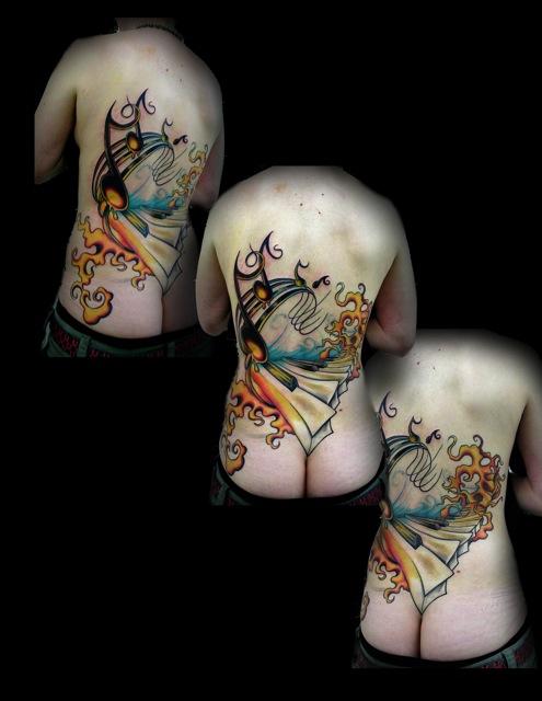 En ce qui concerne ton projet, je suis aussi portée pas mal sur la musique et en te lisant, la première chose qui m'est venue à l'esprit, ce sont des motifs d'instruments de musique explosés, d'où pourraient sortir tout un tas d'éléments graphiques genre notes de musiques, lignes entremêlées, fleurs, etc... Tu peux jouer pas mal sur des perspectives exagérées, comme sur ce tattoo (que je trouve sublime ^^):