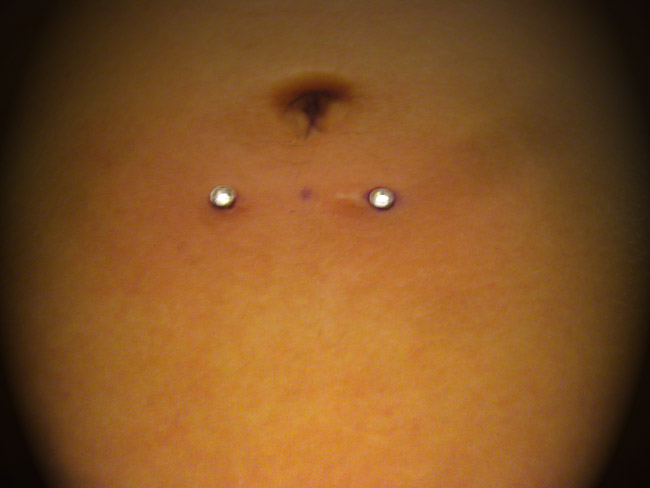 Bodmods : 3 tatouages : cheville, omoplate, reins. piercings : stretchs lobes en 20, lobes, cartilages, tragus en 2mm, nez, nombril en 5 mm, labret en 9 mm, un septum en 8 mm. Une femme (+15kg)