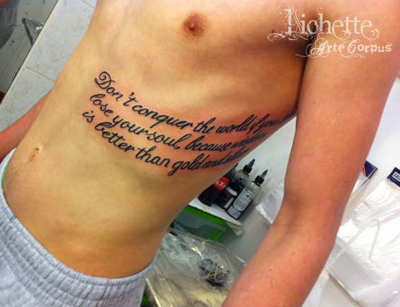 tout petit lettrage sur les cotes... premier tatouage du jeune homme qui a fort bien résisté à la douleur :)