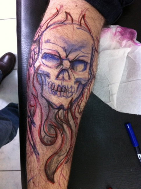 cette séance au feutre sur le mollet de Freddy permettra une prise de "calque", d'avoir les proportions et l'empreinte de la jambe avec son dessin pour travailler le motif à plat....