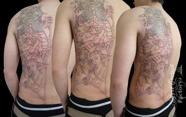 Alors, début d'un nouveau "chantier", la première séance d'un bodysuit sur ramiro, qui s'étendra sur la manchette, l'épaule et le pec... On est partis pour un joli feuilleton en couleur!