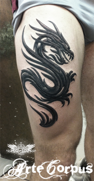 Bodmods : Piercings : 6 lobes, double hélix (gauche), langue / Tatouages : dragons dos, lettrage draconique pied gauche