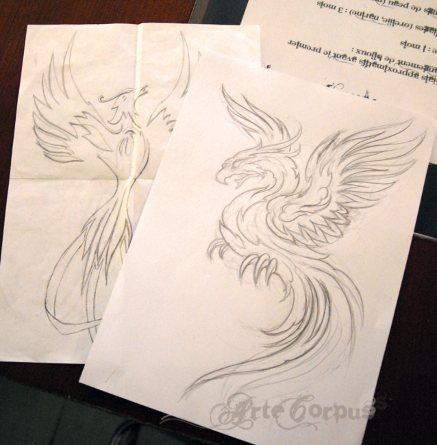 Deuxième étape, après une petite discussion qui me permet de mieux cerner sa demande, je fais un croquis afin que mon client puisse se faire se idée de l'aspect de son futur tattoo.