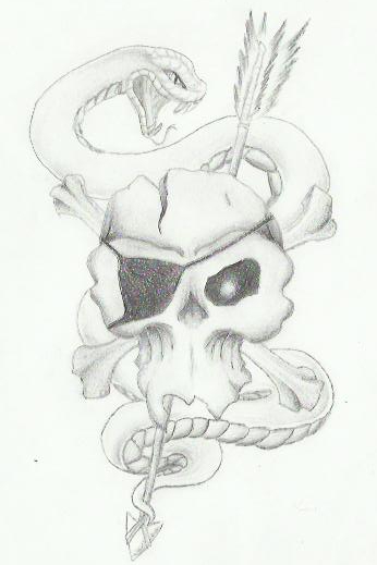 J'ai retravailler le crane avec un crayon 3B(Quelqu'un a dit gras?)... seul probleme c'est pour le serpent, le trait est beaucoup moin précis(pas très taillé le crayon) surtout au niveau de la tete... j'aurais du changer de crayon